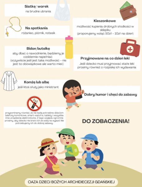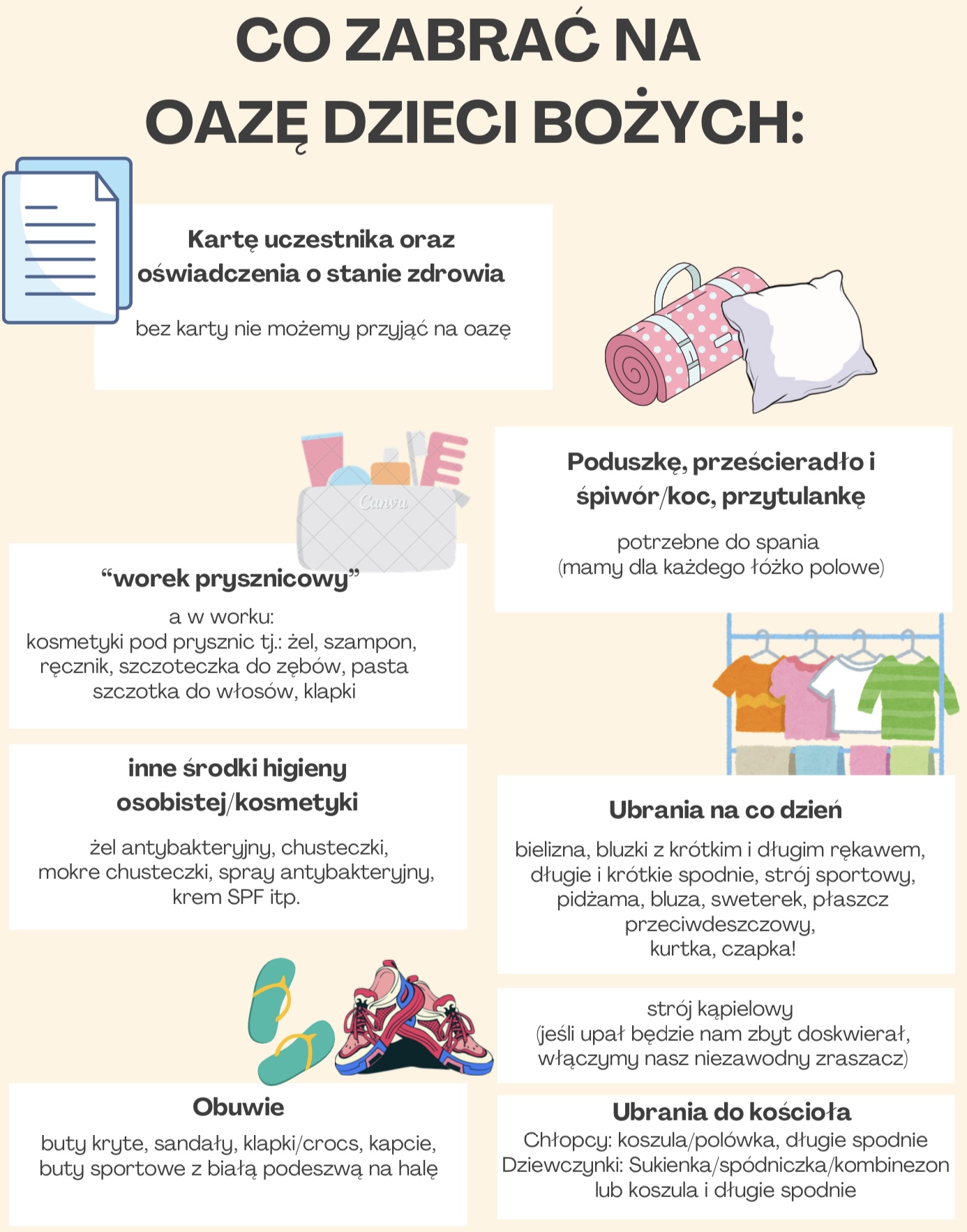 Jak przygotować dziecko do pobytu na rekolekcjach oazowych? Atmosfera domu i rozmowy z rodzicami są niezastąpione wraz z modlitwą rodziców - aby dziecko jak najgłębiej przeżyło ten czas. Jeśli zaś chodzi o przygotowanie = pakowanie... to pomoże poniższy poradnik, przygotowany przez kadrę rekolekcyjną.